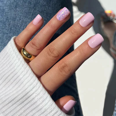 Light pink and purple glitter will have you feeling and looking like the prettiest girl in the world. These short square nails feature the perfect mix of light pink and accent nails that are topped off with a multi-toned and multi-shaped nail glitter. Apply with acrylic, nail glue, or tabs and get long-lasting, salon-quality nails in minutes.