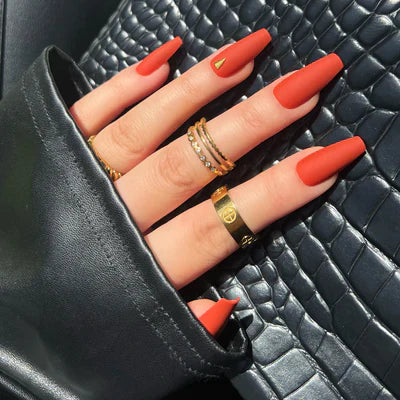 Take your nails from 0-100 with "Sienna. The fiery press-on nail look incorporates a striking matte red shade that’ll have you red-carpet ready all day long. Topped off with a gold jewel, Sienna is perfect for any special occasion and looks beautiful all year round. Apply with acrylic, nail glue, or tabs and get long-lasting, salon-quality nails in minutes.